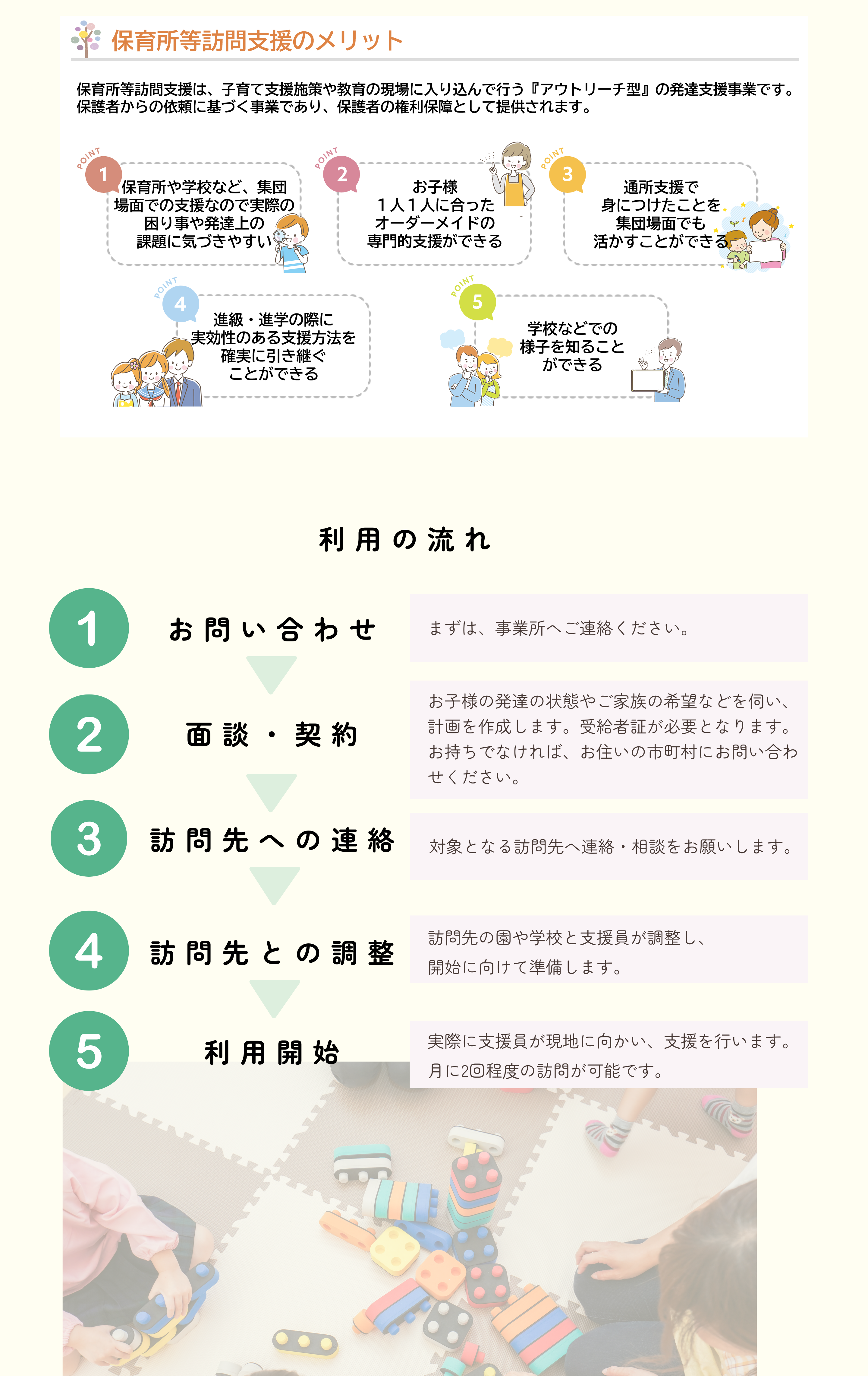 お子様が保育所や、幼稚園、学校などの施設で楽しく生活を送るために、支援員が園や学校に訪問して実際にお子様の様子を観察し先生方と相談しながらお子様の困りごとを解決に導いていく支援を行います。 またお子様に合わせた目標を立て、園や学校での様子をお伝えし保護者の方と一緒に支援の方法を話し合っていきます。